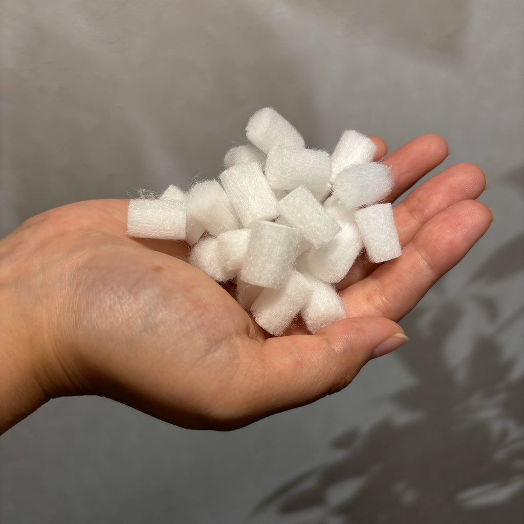 そこで、詰物に2種類のチップとわたを詰め、しっかりとした弾力性と柔らかな感触で心地よく高級感のある枕に仕上げました。